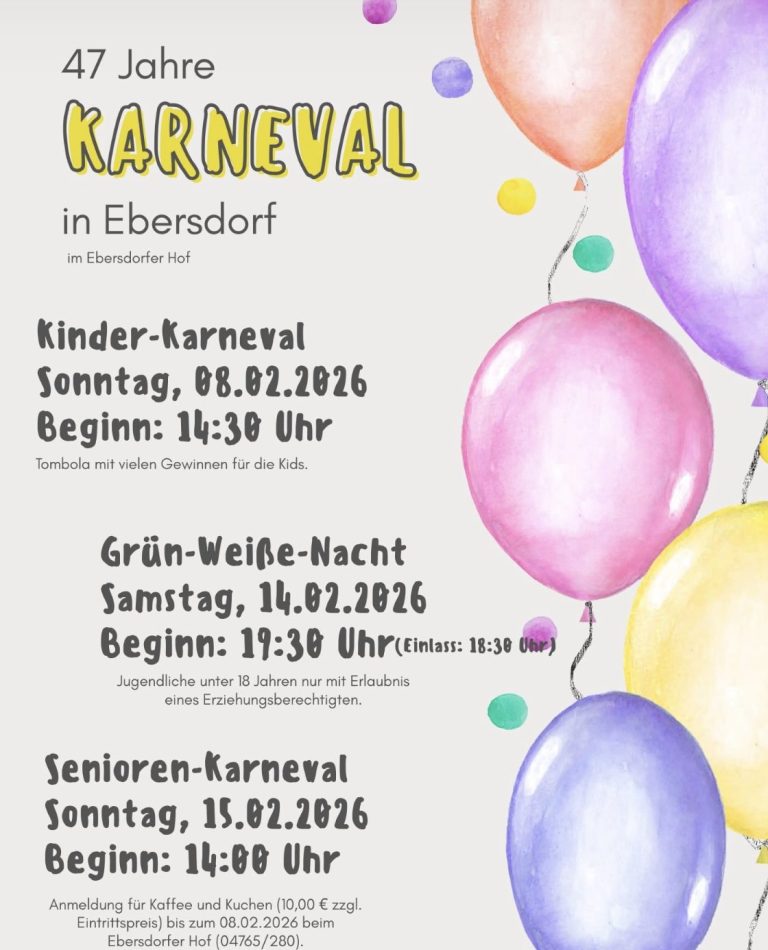 Am Sonntag, den 08.02.2026 ist es wieder soweit: unser alljährlicher Kinderkarneval steht an! Ab 14:30 Uhr gibt es Spiel und Spaß im Ebersdorfer Hof. Die Kinder können tanzen, lachen, staunen und sogar bei der großen Tombola gewinnen.