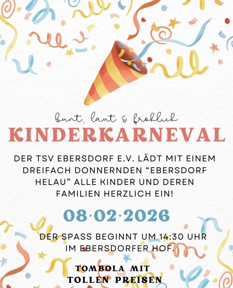 Am Sonntag, den 23.02.2025 um 14:30 Uhr lädt der TSV Ebersdorf zum Kinderkarneval in den Ebersdorfer Hof ein! Es gibt eine Tombola mit vielen tollen Gewinnen sowie ein buntes Programm. Wir freuen uns auf euren Besuch!